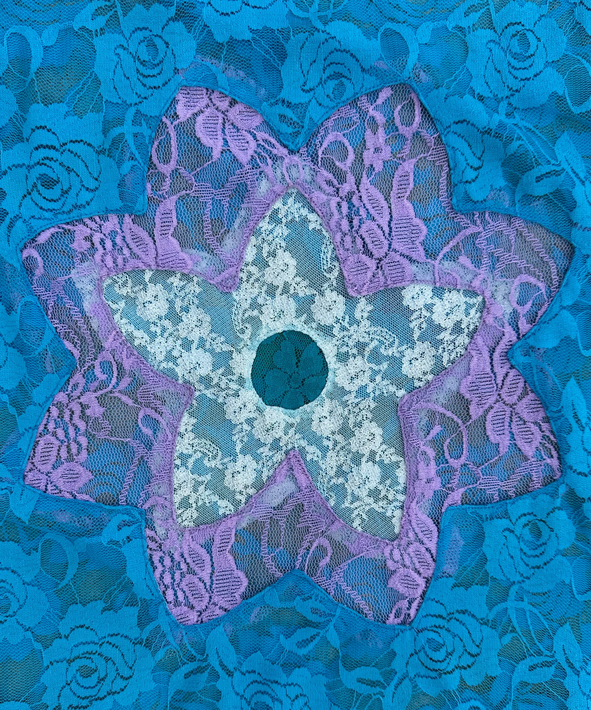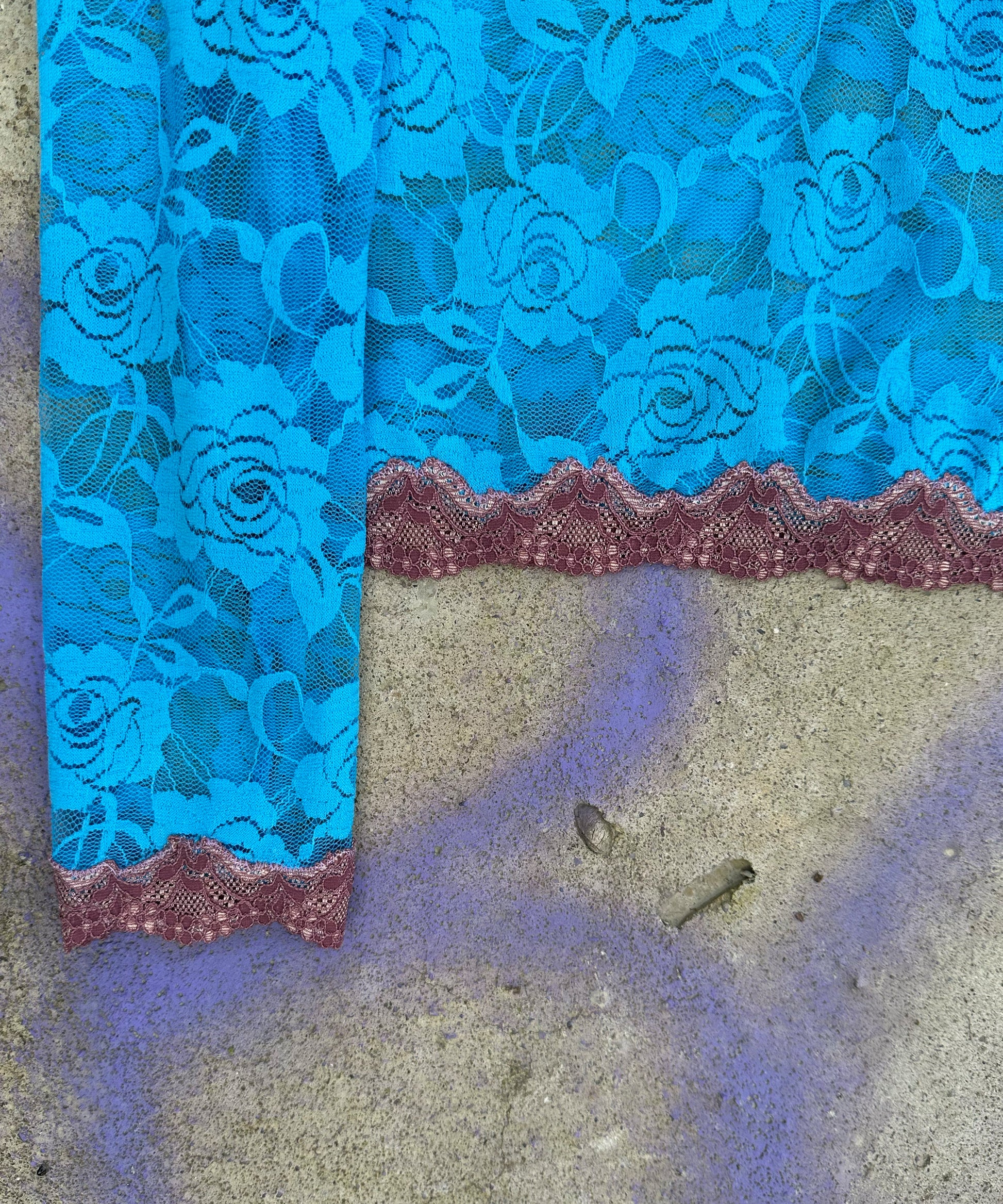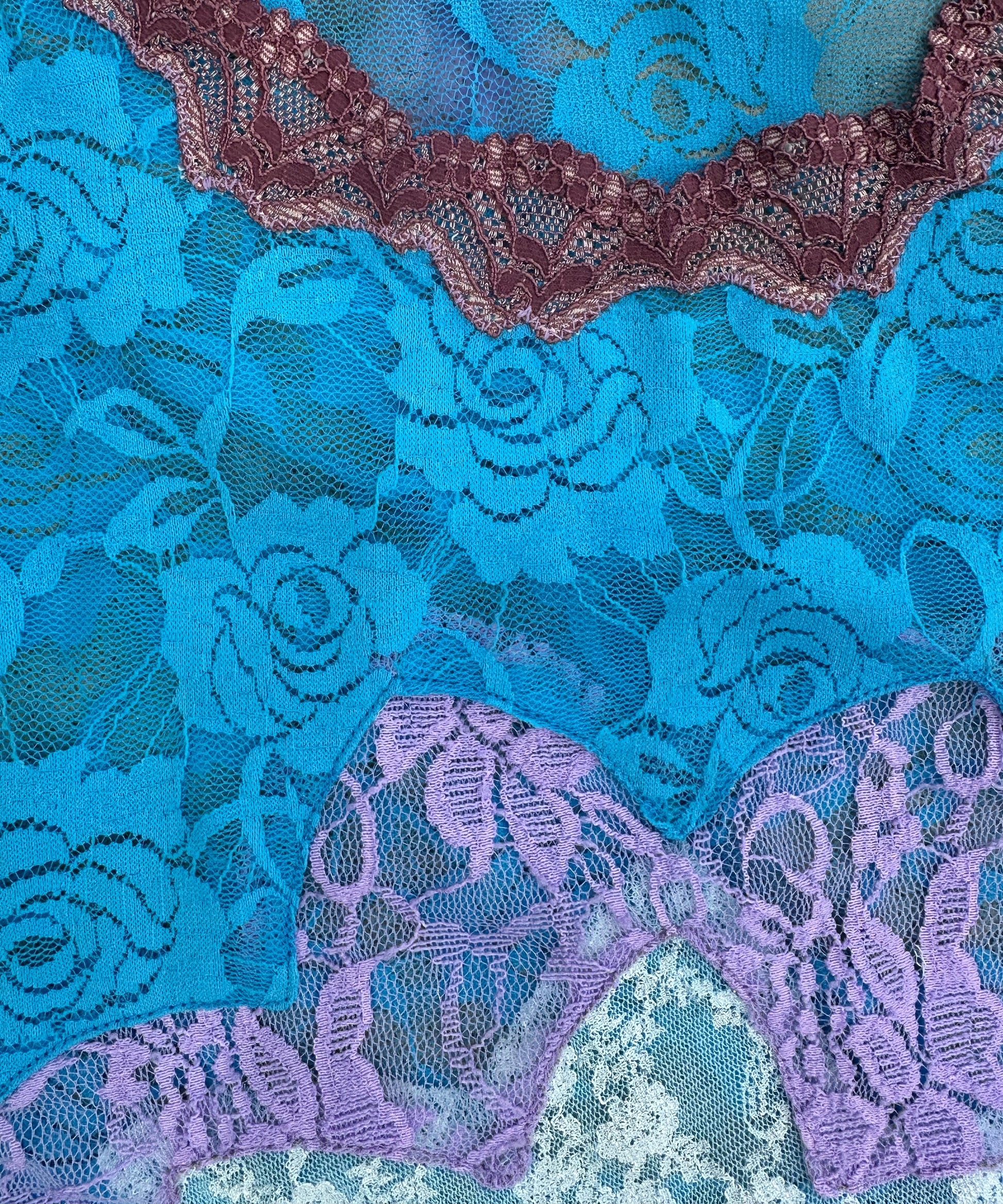 Unique Colors: Sheer stretch cerulean blue base with layered lilac and cerulean blue lace