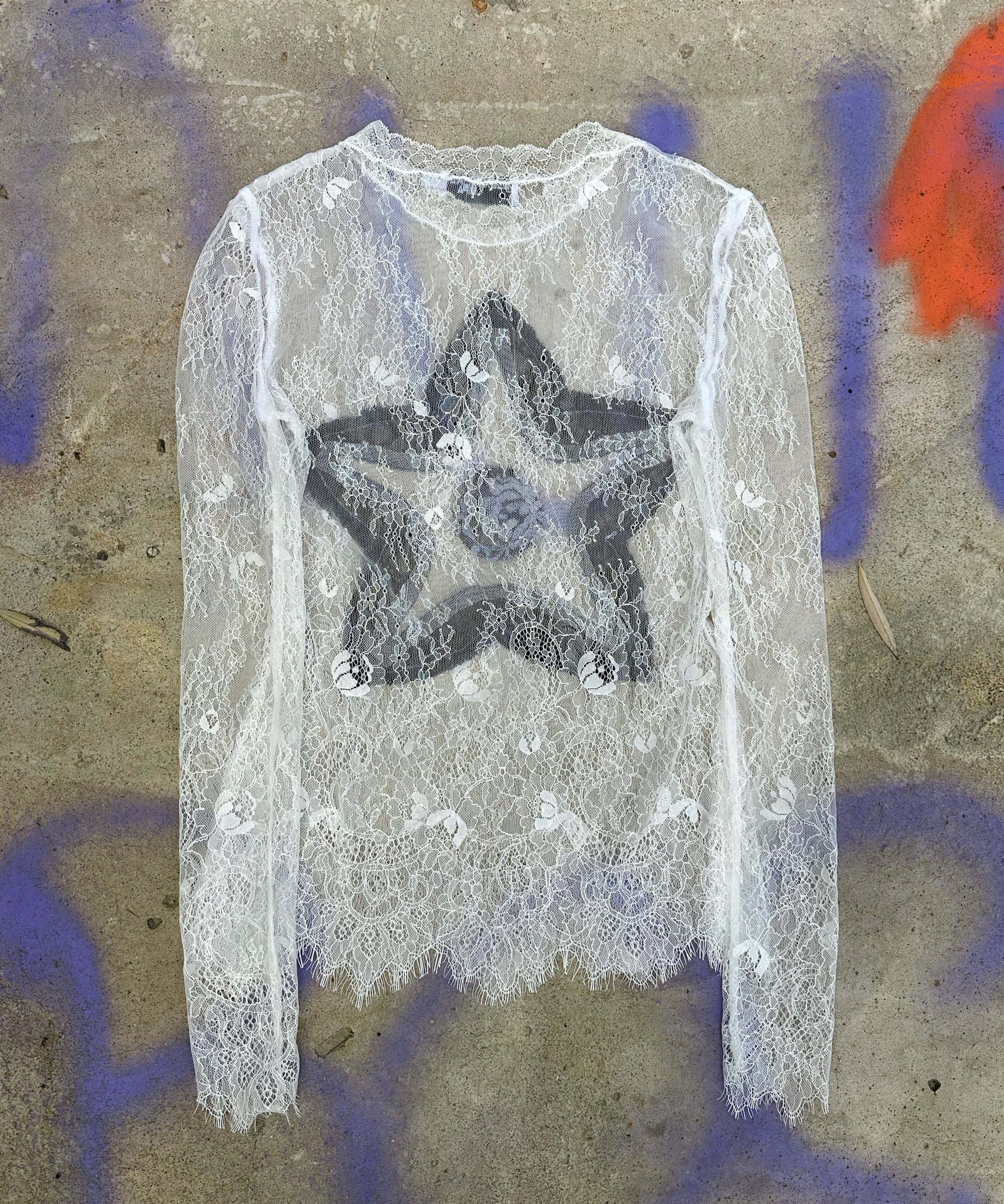 This striking long sleeve tee is a unique creation made from SS26 collection fabric remnants. Bold, edgy, and ethereal - the Ghost Star Tee features a dramatic black and white lace design that's truly one-of-a-kind.