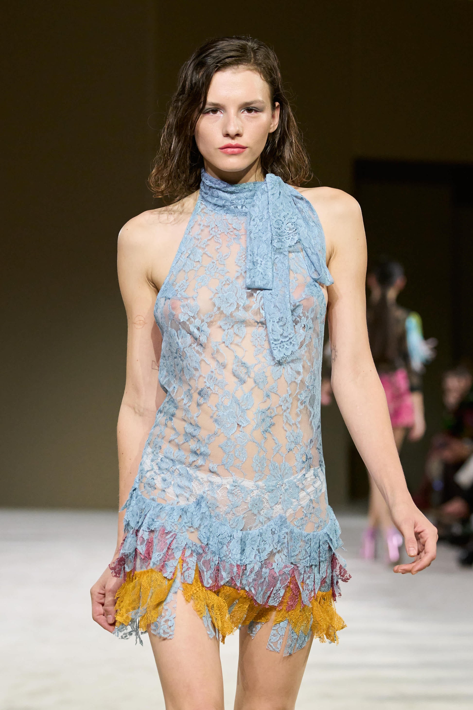 Halter-neck bow dress. Features chantilly lace hand cut fringe arches, in multicolored layers, all around the bottom of the dress.