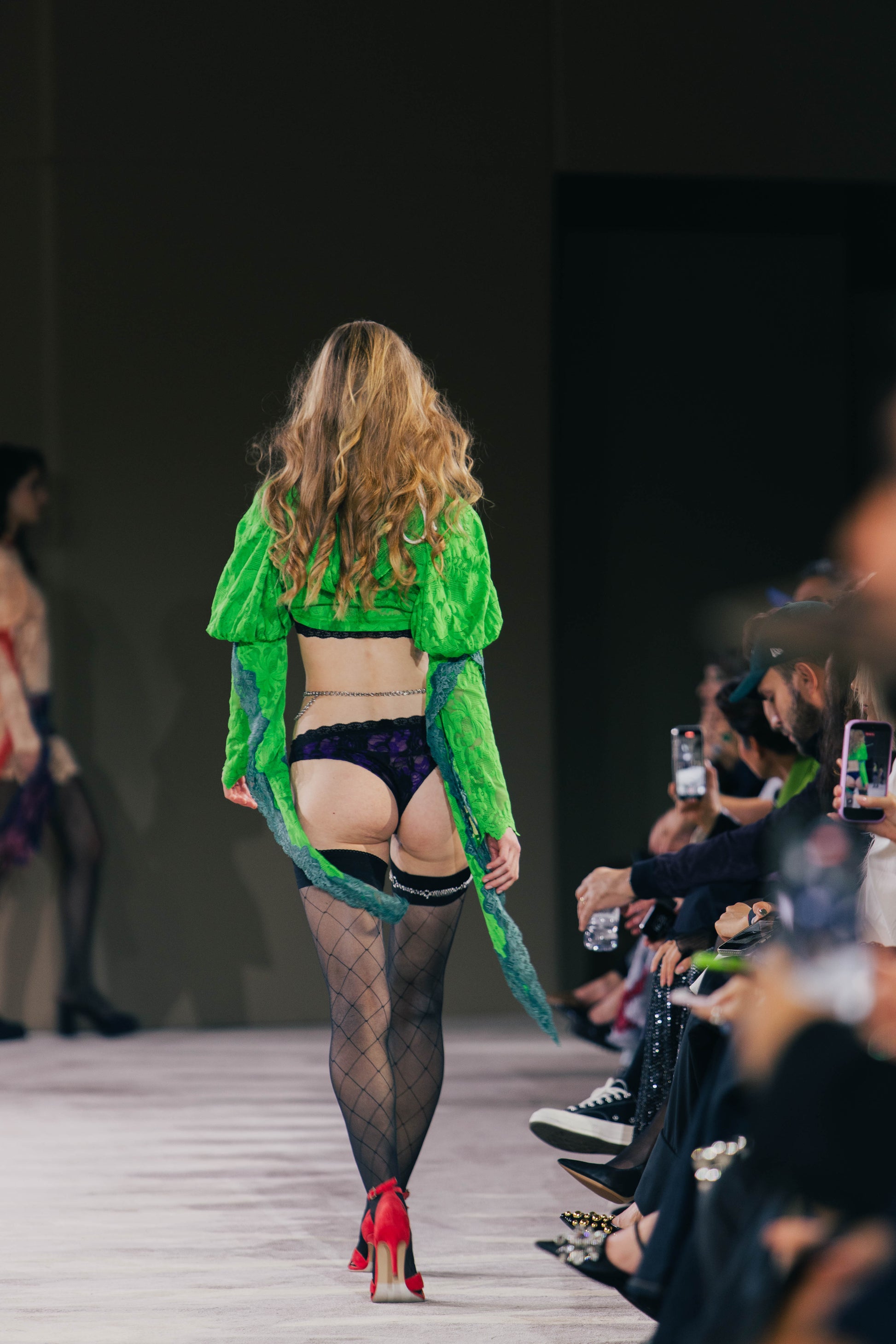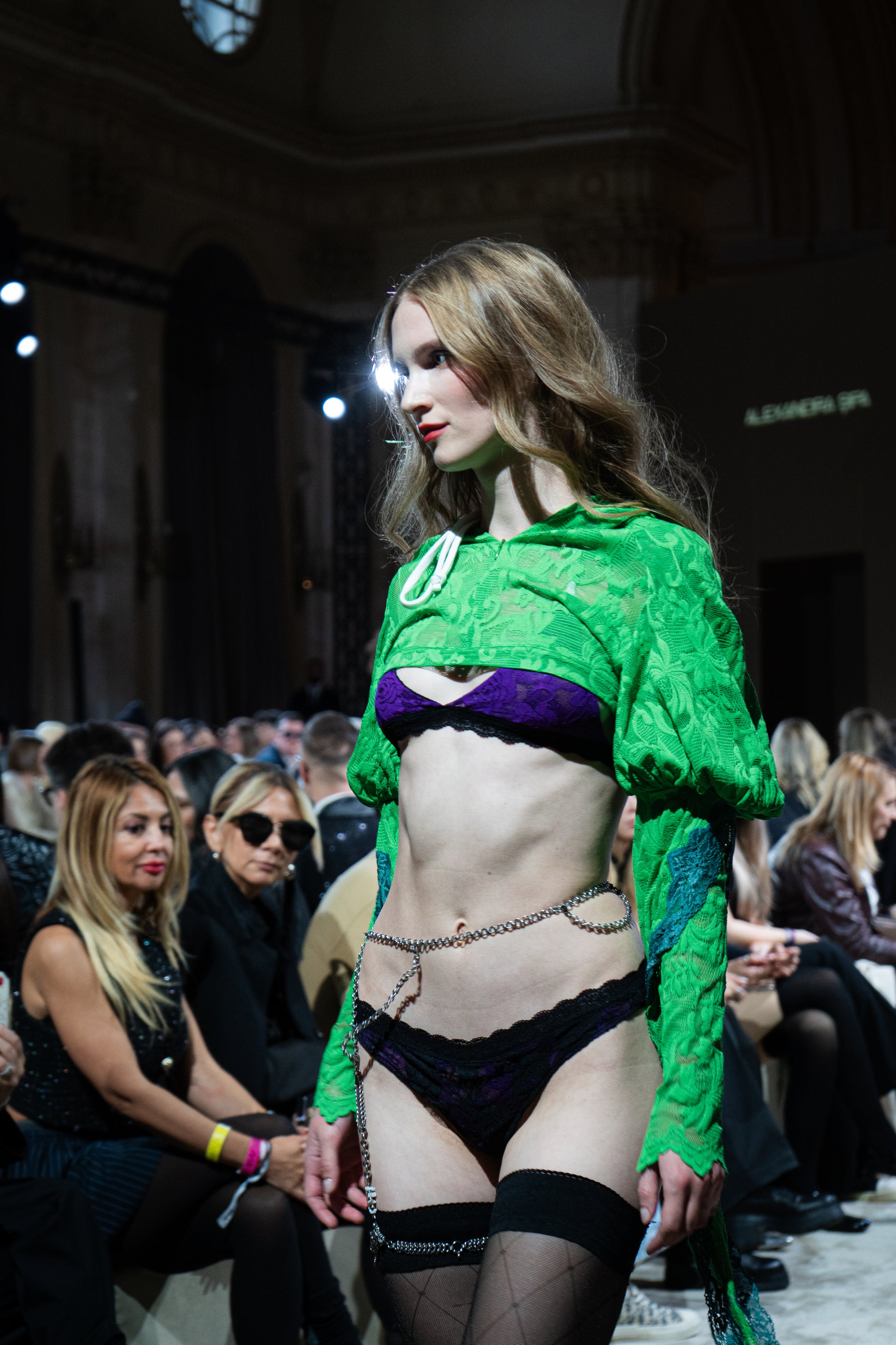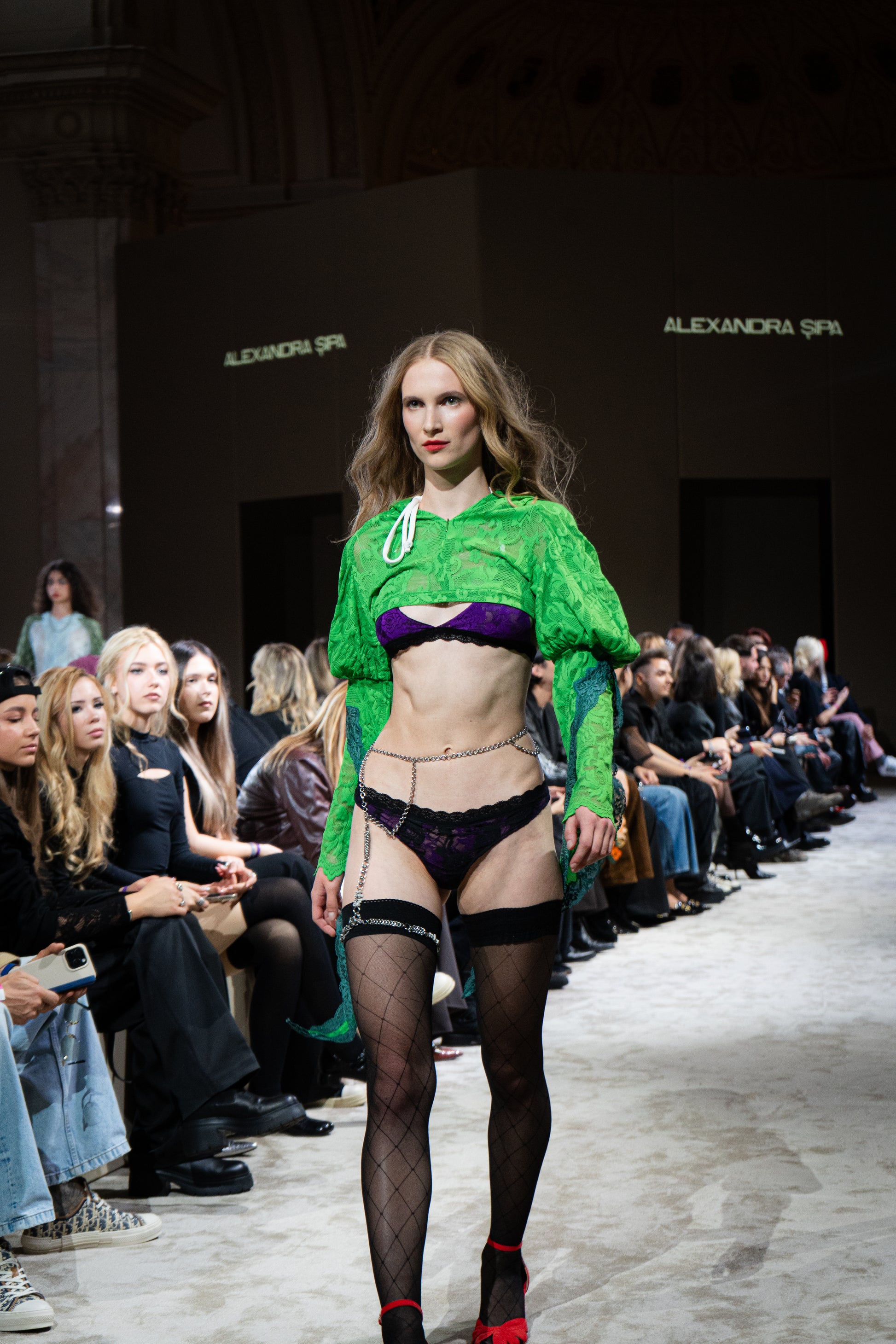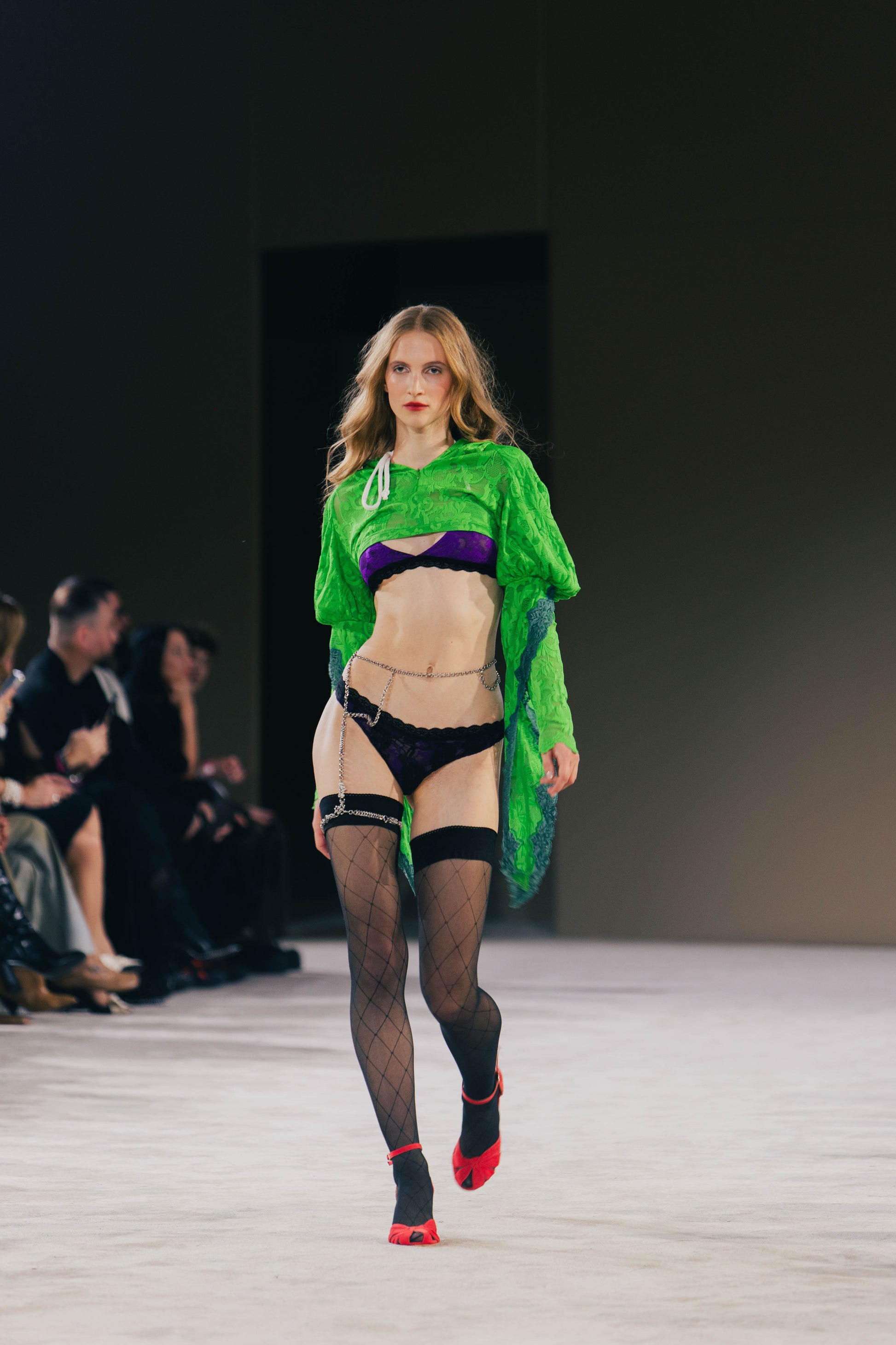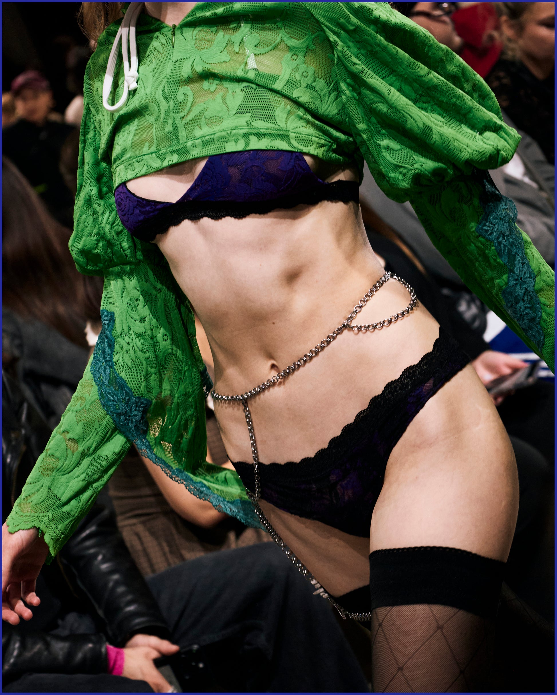 Stretch green lace zip up hooded top. Invisible frontal zipper.