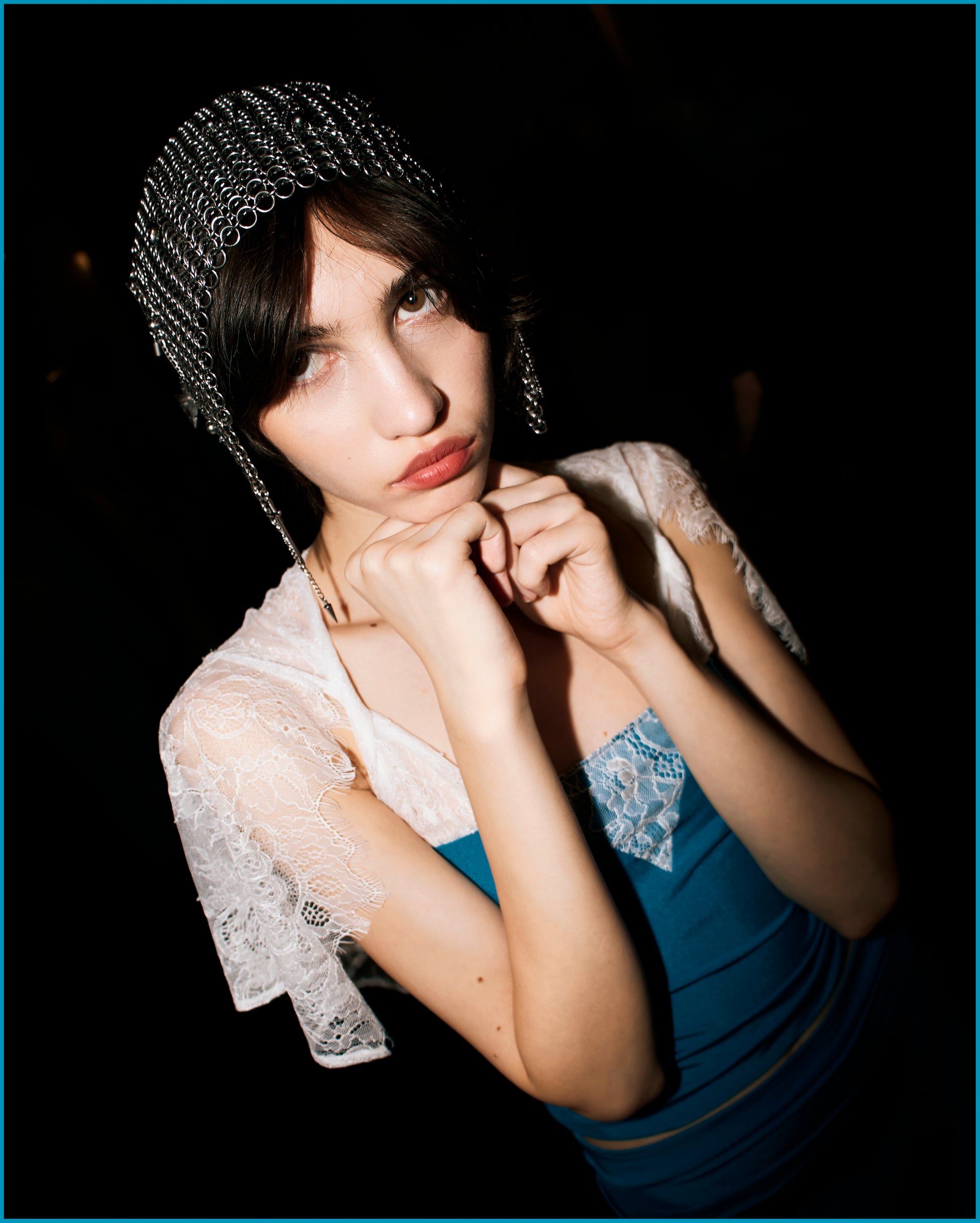 Stretch blue lycra and white lace top. Features a short cape.